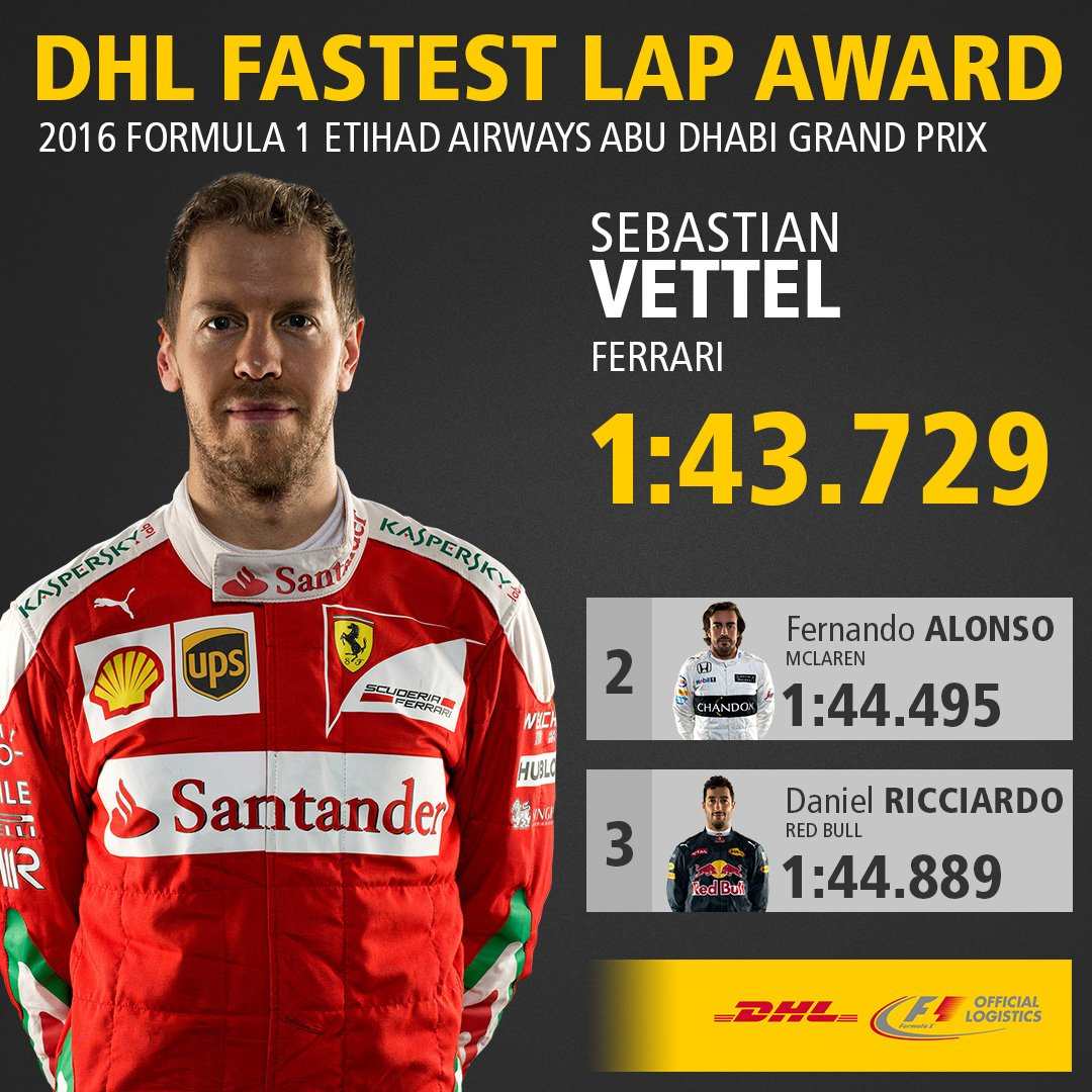 Paskutiniame 2016 m. sezono etape Abu Dabyje greičiausią lenktynių ratą įveikė varžybų pabaigoje geriausią tempą palaikęs ir trečias finišo liniją kirtęs „Ferrari” pilotas Sebastianas Vettelis.
