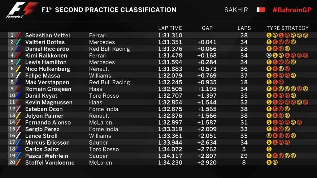 Ką tik pasibaigė antrosios laisvosios treniruotės Bahreine, greičiausią laiką užfiksavo Sebastianas Vettelis, antras Valtteri Bottas, trečias Danielis Ricciardo.
