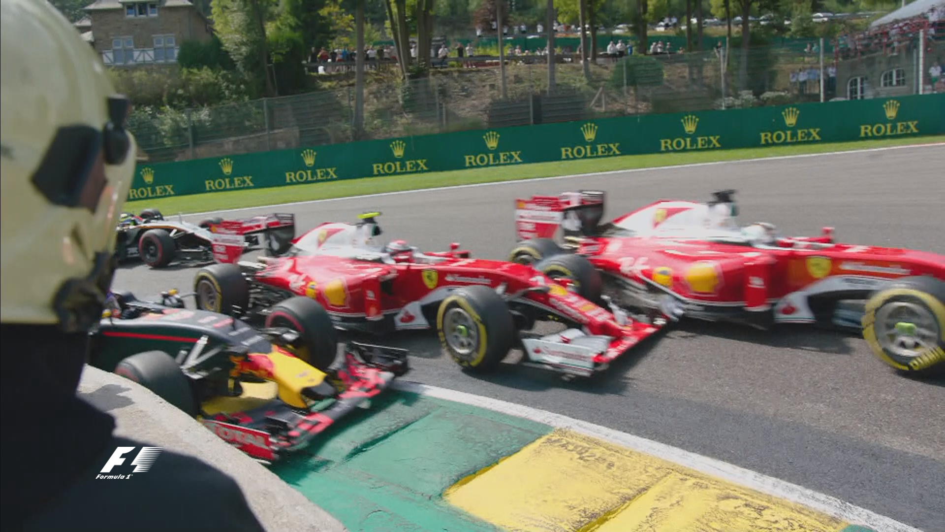 Belgijos GP lenktynės prasidėjo itin chaotiškai, lenktynių starte į pirmą posukį netilpo trys pilotai – Maxas Verstappenas, Kimi Raikkonenas ir Sebastianas Vettelis. Prastai startavęs olandas iš „Red Bull” buvo už abiejų „Ferrari” pilotų, tačiau bandė stabdyti daug vėliau bei užimti vidinę trajektoriją, tačiau trys bolidai viename posūkyje netilpo. Sebastianas Vettelis apsisuko ir nukrito į paskutinę vietą, Kimiui Raikkonenui buvo pradurta padanga, o Maxui Verstappenui sulaužytas priekinis sparnas.