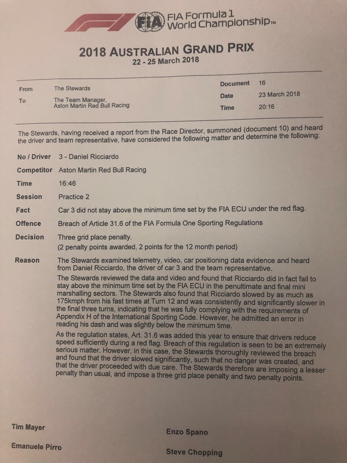 Tačiau paaiškėjo, kad D. Ricciardo nesumažino greičio iki pakankamo, kai trasoje buvo mojuojamos raudonos vėliavos ir gavo trijų startinių pozicijų baudą lenktynėse.