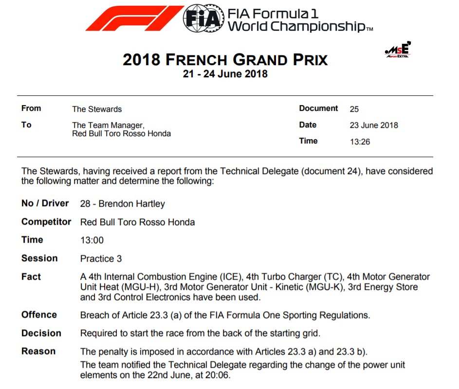 Brendonas Hartley sekmadienio lenktynėse turės startuoti iš paskutinės vietos, kadangi jo bolide buvo pakeistas visiškai naujas „Honda“ variklis.