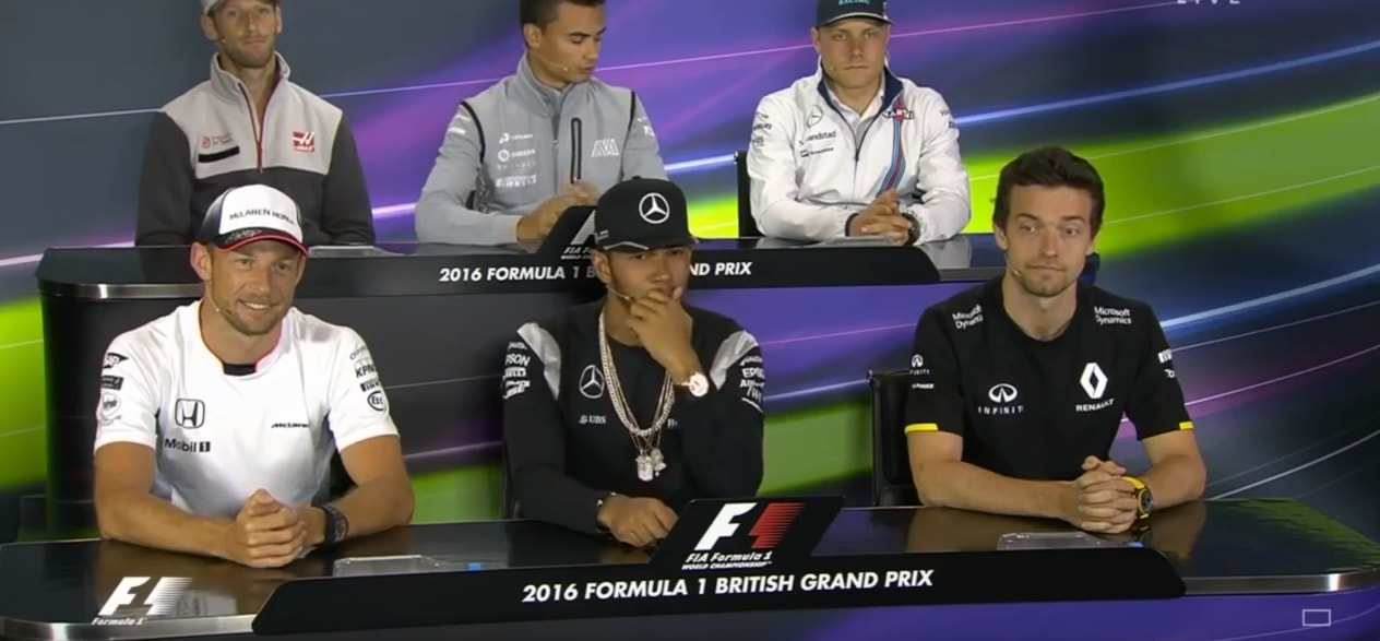 Didžiosios Britanijos GP pilotų spaudos konferencija. Joje dalyvauja šie pilotai: