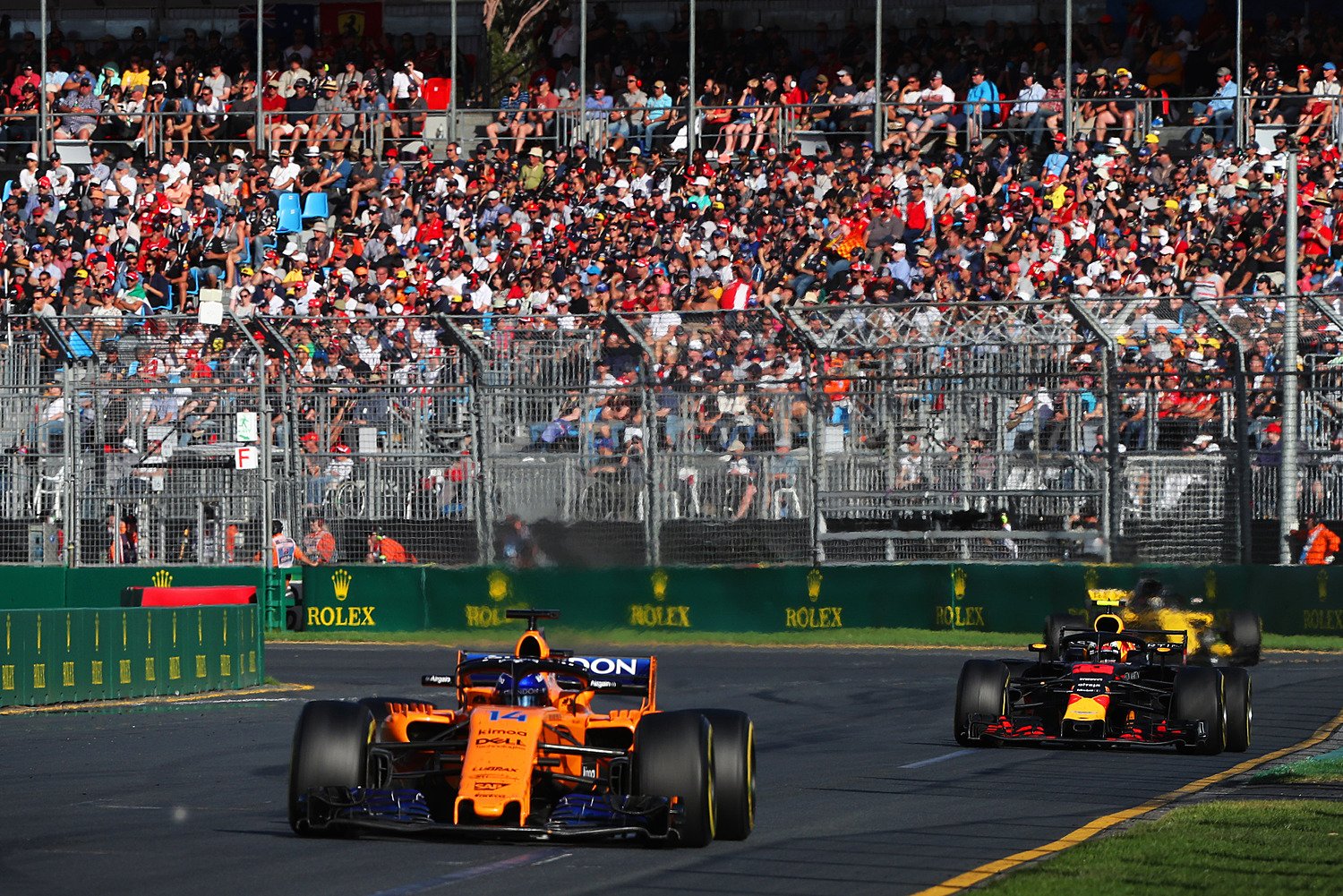 Fernando Alonso pasinaudojo tuo, kad prieš jį buvę du lenktynininkai pasitraukė iš lenktynių ir trasoje pasirodė saugos automobilis. Ilgą laiką ispanas kovojo dėl geresnės pozicijos su „Renault“ lenktynininku Carlosu Sainzu.