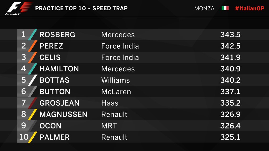 Pirmoje Italijos GP treniruotėje greičiausią ratą įveikė „Mercedes” pilotas Nico Rosbergas, už vokiečio, antroje vietoje komandos draugas Lewisas Hamiltonas, trečias – „Ferrari” lenktynininkas Kimi Raikkoennas.