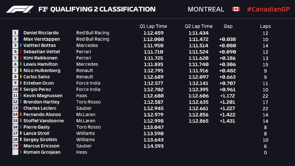 Kanados GP kvalifikacijoje nugalėjo Sebastianas Vettelis, antroje vietoje liko Valtteri Bottas, trečioje – Maxas verstappenas.
