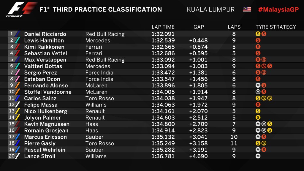 Trečioje Malaizijos GP treniruotėje greičiausias buvo „Ferrari” komandos lenktynininkas Kimi Raikkonenas, antroje vietoje liko Sebastianas Vettelis, trečioje – Danielis Ricciardo.