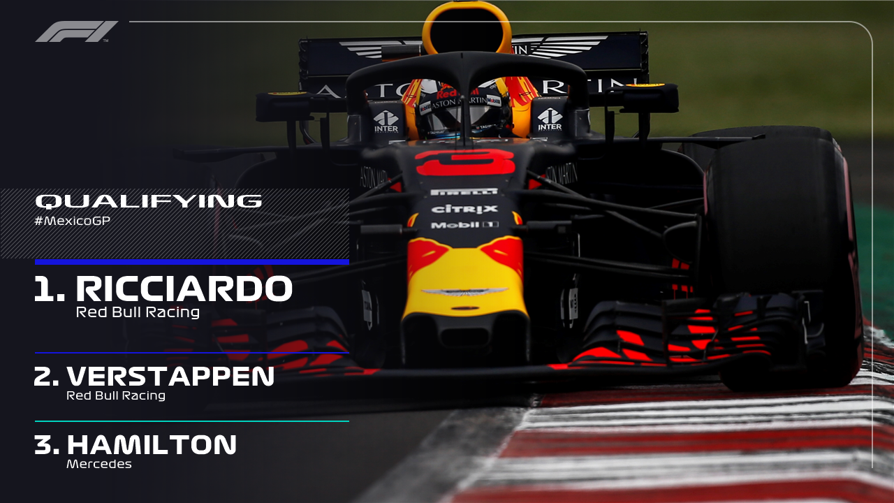 Meksikos GP kvalifikacijoje nugalėjo ir iš pirmos vietos lenktynėse startuos Danielis Ricciardo, antras Maxas Verstappenas, trečias – Lewisas Hamiltonas.