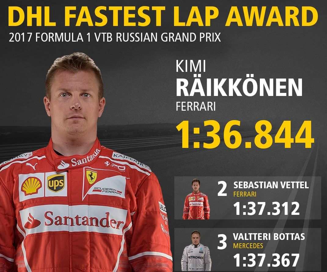 Ketvirtosiose 2017 m. sezono lenktynėse Rusijoje geriausią rato įveikimo laiką pademonstravo „Ferrari” pilotas Kimi Raikkonenas.