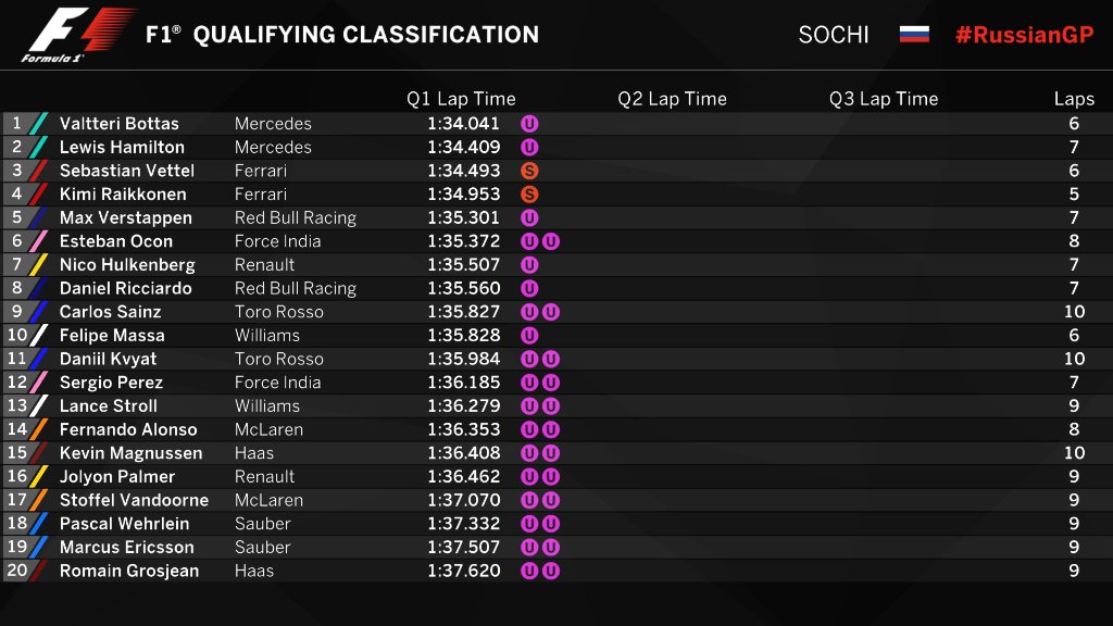 Anrtąją kvalifikacijos dalį pirmieji pradėjo „Williams” pilotai nors trasoje dar buvo mojuojamos geltonos vėliavos. Kimi Raikkonenas pirmą kartą panaudojo minkščiausių padangų komplektą ir nuvažiavo greitą ratą, tačiau „Mercedes” ekipa nuvažiavo greičiausią savaitgalio ratą, kuris buvo 0.8 sekundės greitesnis už visus šio savaitgalio laikus. Valtteri Bottas ratą įveikė per 1:33.264 sekundės.
