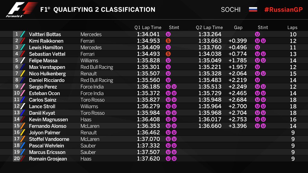 Sebastianas Vettelis ir Kimis Raikkonenas buvo vieninteliai lenktynininkai pirmąją kvalifikacijos dalį pradėję su super minkštosiomis padangomis, visi kiti pilotai naudojo ultra minkštąsias padangas. Valtteri Botto laikas su minkštesnių padangų komplektu buvo greitesnis tik 0.452 sekundės lyginant su Sebastiano Vettelio laiku.