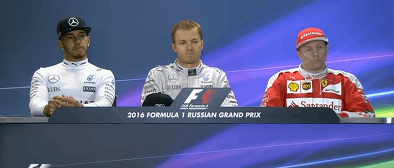 Vairuotojų spaudos konferencija, po Rusijos GP lenktynių. Pirmosios vietos laimėtojas Nico Rosbergas, antrosios – Lewisas Hamiltonas, trečiosios – Kimi Raikkonenas.